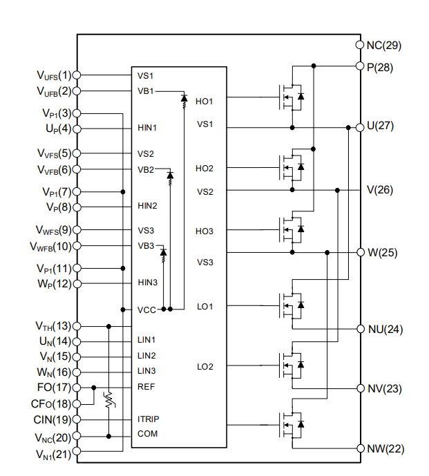 IPM29- SiC_MOS新系列產(chǎn)驅動(dòng)集成了自舉電路、一體化使能與可調故障輸出(FO)、防直通互鎖、欠壓保護與溫度輸出功能,優(yōu)化的高壓柵極驅動(dòng)配合內集成的高速、低阻抗SiC_MOSFETS逆變橋,極大地改善產(chǎn)品工作EMI特性與開(kāi)關(guān)損耗,適用于高頻開(kāi)關(guān)需求的電機驅動(dòng)應用。